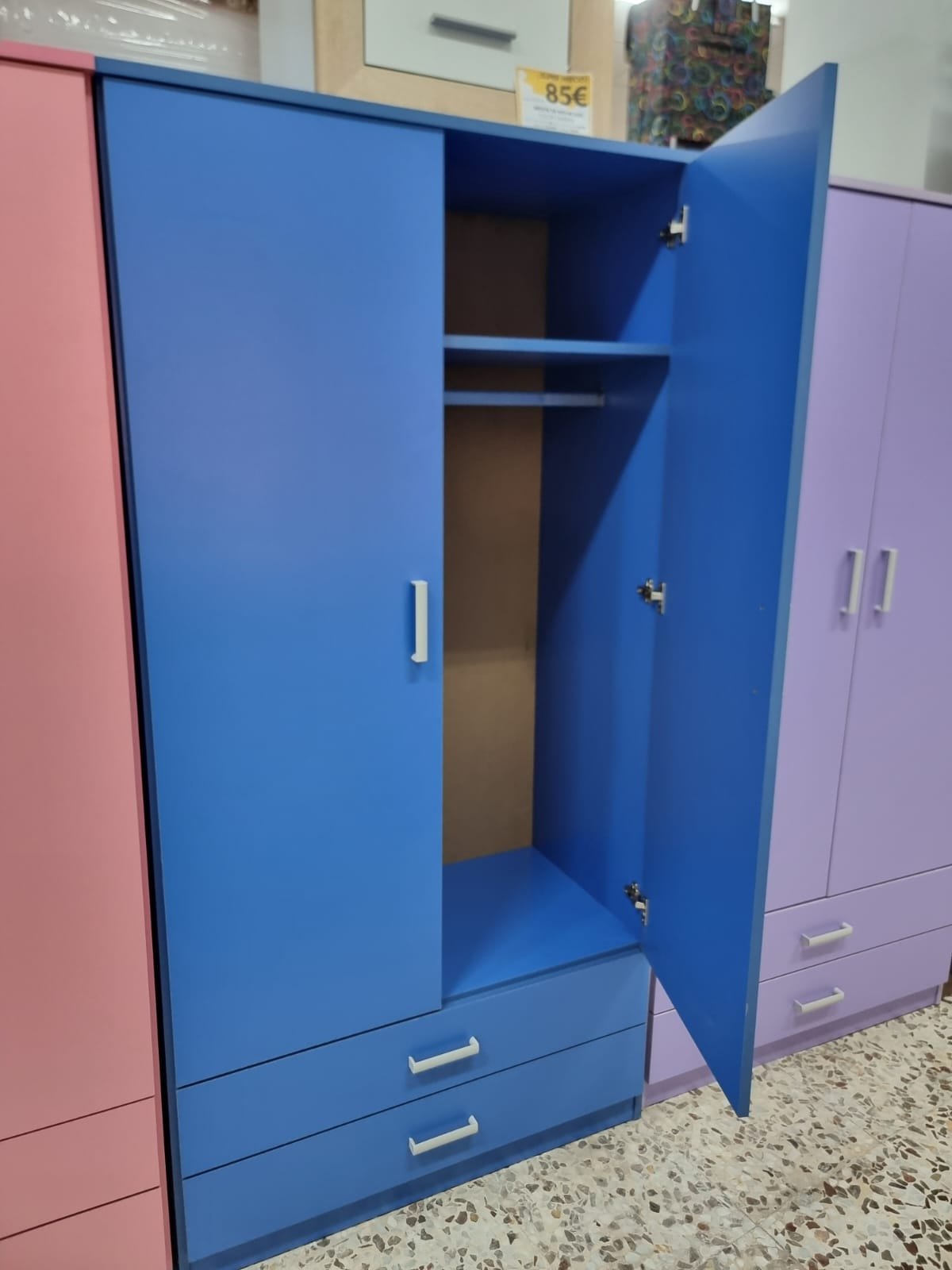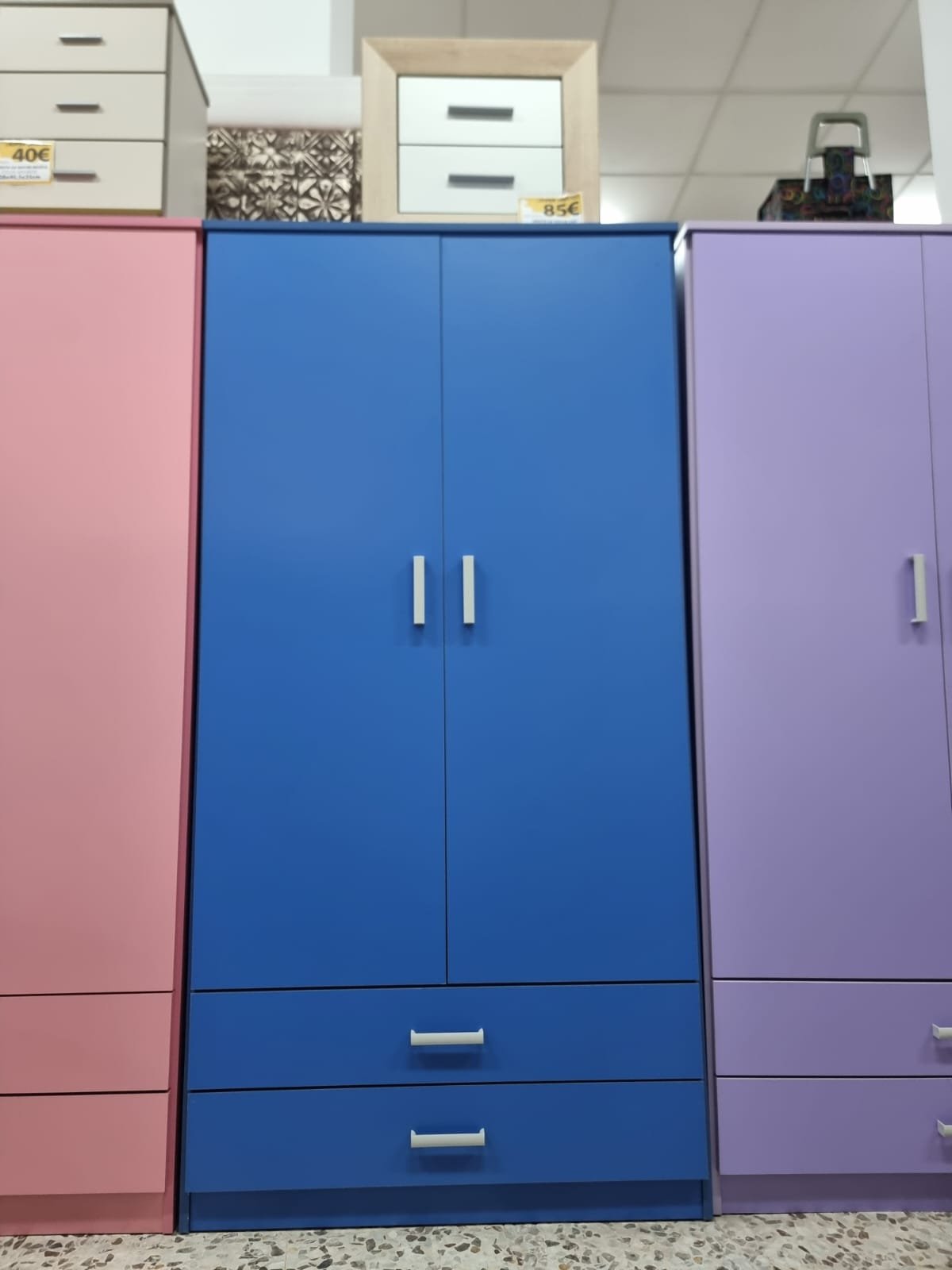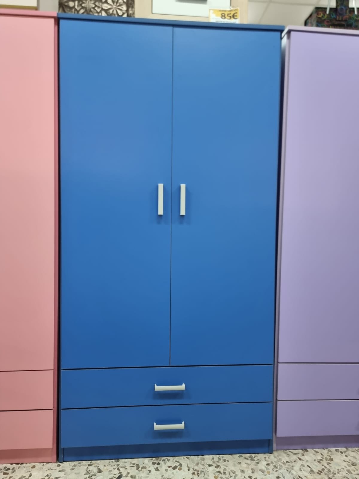 Armario 2 puertas + 2 Cajones. Color Azul. Espacio amplio modo percha y 2 cajones en la parte inferior. Adecuado para habitaciones juveniles y para aprovechar el espacio en dormitorios pequeños.