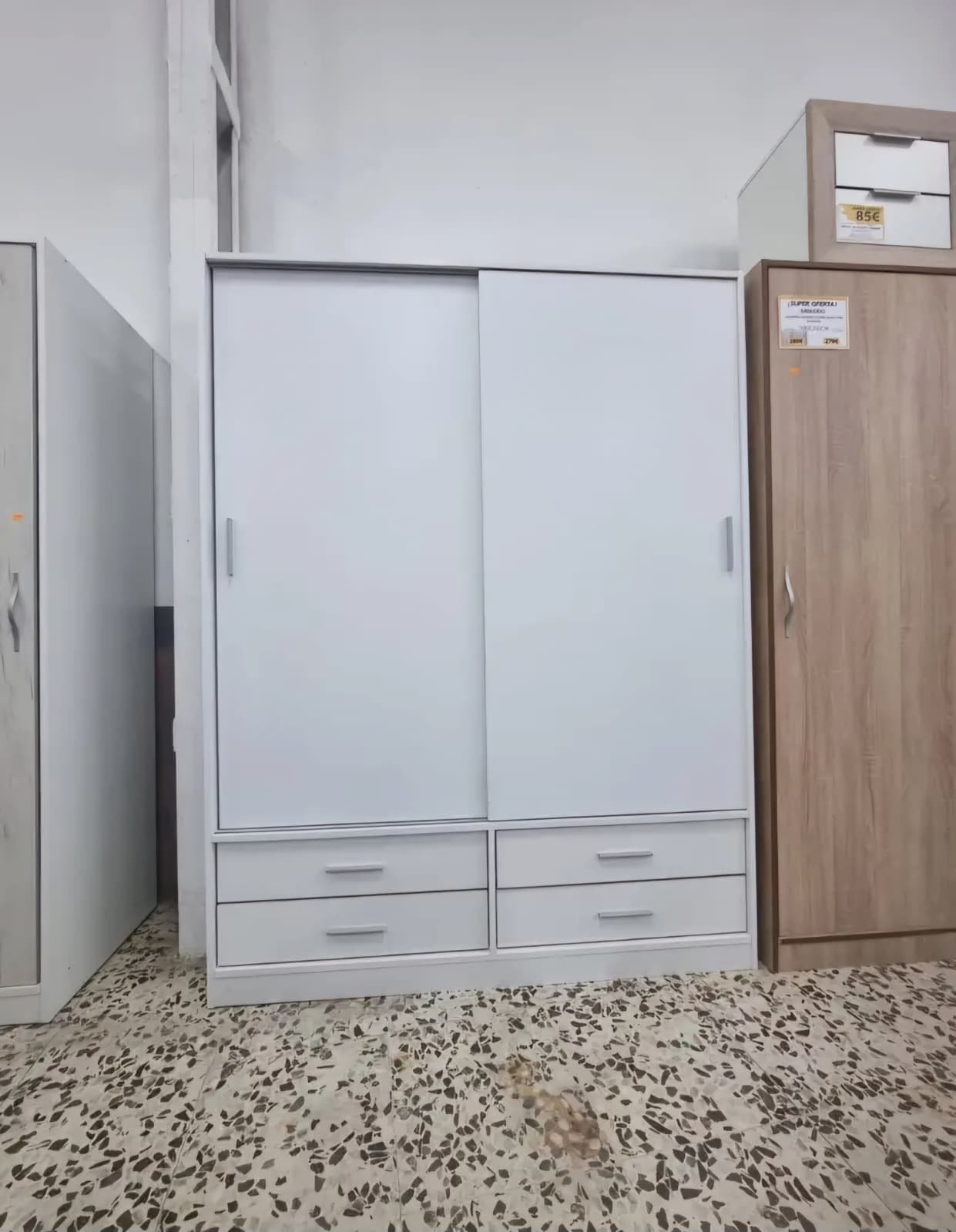 Armario de puertas correderas . Color Blanco. 2 Espacios amplio para percha y 4 cajones en la parte inferior. Perfecta para habitaciones individuales o matrimoniales.